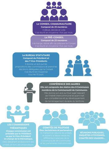 Différentes instances régissent le fonctionnement de la Communauté de communes du Pays des Écrins.